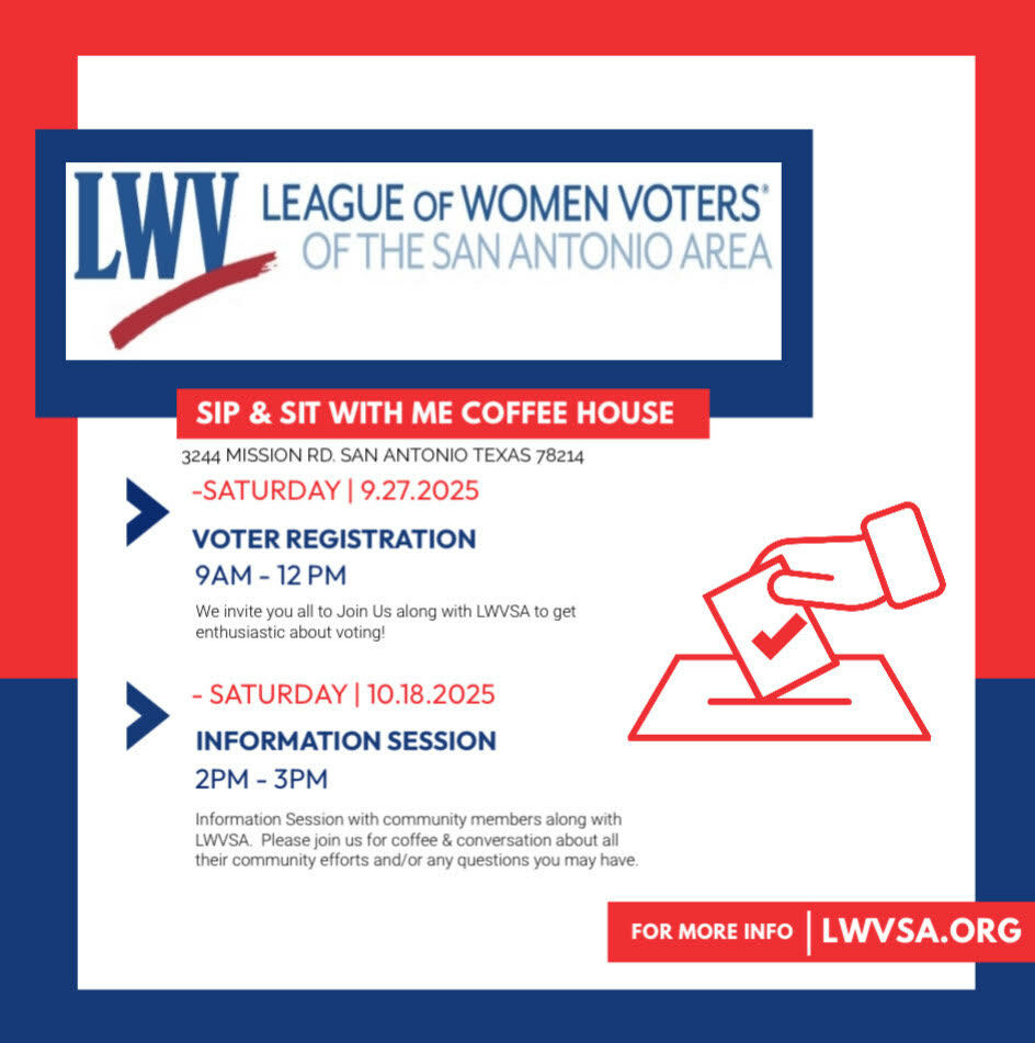 On Saturday, October 18, we are taking Get to Know the League of Women Voters of the San Antonio Area on the road. Sip & Sit with ME Coffee House has invited the League to hold a conversation with community members about the League. We will be discussing the work we do to expand civic participation and to give a voice to all through education efforts and advocacy. Maybe you have used the League's Voters Guide or encountered one of our volunteers in the community registering voters and want to know more about what we do in Bexar County. This is your opportunity to meet members of the League Board and have a conversation with us. We hope you can attend. Coffee is on us so bring a friend.