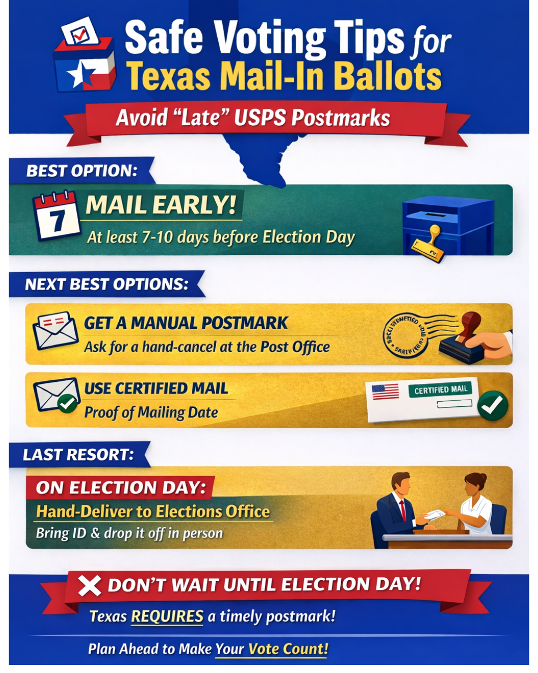 Get your mail ballot in early. The consolidation of Postal Service regional processing centers from 200 to 60 might cause mail ballots to be postmarked a day or more after mailing. Mailed Texas ballots must be postmarked by Election Day (Tuesday, March 3, 2026) and received by the next day to be counted, so it’s important to get your ballot mailed well before the deadline.